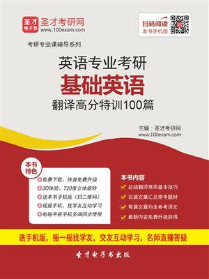 《英语专业考研基础英语翻译高分特训100篇》是由圣才考研网组织人员精心编写而成的,本书旨在帮助考生全面提高翻译水平和应试能力,轻松应对“基础英语”考试中的翻译部分。本书总结归纳了常用的翻译技巧,并精选出100篇文章。这些文章内容新颖,语言地道,涵盖了政治、经济、文化、法律、环保、科技、旅游、社会热点等多方面题材,每篇文章均有参考译文。