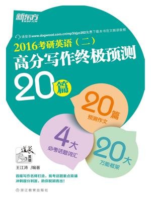 《(2016)考研英语(二)高分写作终极预测20篇》为新东方考研写作首席名师王江涛老师依照新版考研英语大纲编写而成,全书共分为3章:前两章分别为小作文和大作文的10大预测范文和10大万能框架,全面涵盖了2016考研大小作文的可考话题和题型;第三章为考研写作核心词汇,为考生提供4大必考话题的核心词汇及短语,帮助考生写出高分考研作文。 小作文涵盖多种必考应用文,大作文的预测范文分为社会热点类和教育文化类,其中各大类话题下的范文又具体划分为不同的小话题,作者基于对于考研写作规律的精准把握,预测2016考研写作的命题趋势,便于考生在考前积累词句,了解和掌握重点话题的写法。 预测范文均配有参考译文、亮点词汇、道长点评、和经典句型,此外大小作文还分别包含10大万能框架,帮助考生迅速组句成篇。 书中的20篇预测范文特邀专业外教朗读MP3音频,读者可以边听边记,将这些金句印在脑海中,以便能在考场上厚积薄发,挥洒自如。