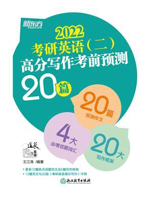 《考研英语(二)高分写作考前预测20篇》为新东方考研人气写作教师王江涛依照新版考研英语大纲编写而成,全书共分为3章:前两章分别为小作文和大作文的10大预测范文和10大写作框架,涵盖了2022考研大小作文的可考话题和题型;第三章为考研写作核心词汇,为考生提供4大必考话题的核心词汇及短语,帮助考生写出高分考研作文。 小作文涵盖多种必考应用文,大作文的预测范文分为社会热点类和教育文化类,作者基于对于考研写作规律的精准把握,预测2022考研写作的命题趋势,便于考生在考前积累词句,了解和掌握重点话题的写法。预测范文均配有参考译文、亮点词汇、“道长”点评、和经典句型,此外大小作文还分别包含10大写作框架,帮助考生迅速组句成篇。
