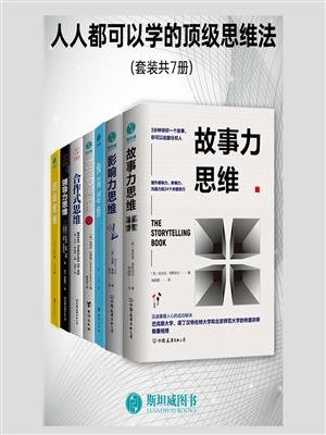 本套装包括《故事力思维:3分钟讲好一个故事,你可以说服任何人》、《影响力思维:破解影响力四大面向,精准提升影响力思维》、《极简思维:颠覆传统思维模式的极简法则》、《NLP思维:高效人士都在用的影响力沟通技能》、《合作式思维:有效掌控、激活群体智慧,轻松提高团队效率!》、《领导力思维(可复制的领导力转型关键!)》、《创业思维:如何快速打造席卷市场的创业公司》。